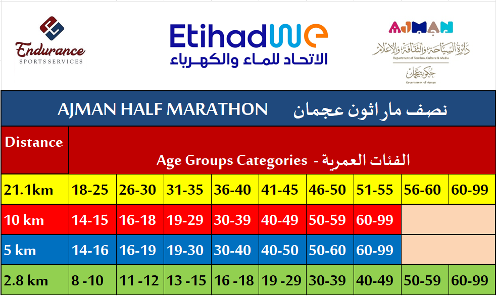 Ajman Half Marathon 2025 The biggest running event in Ajman is back! Ajman Tourism Development Department & Endurance Sports are excited to return to the incredible running series featuring 21.1 km, 10 km, 5 km and 2.8 km distances.