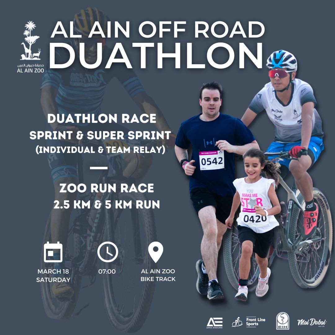 In the celebration of the Earth Hour, Al Ain Zoo and Apex Sports Services are proudly present the first ever Off Road Duathlon event in Al Ain City “the Al Ain Off Road Duathlon" this March 18, 2023.