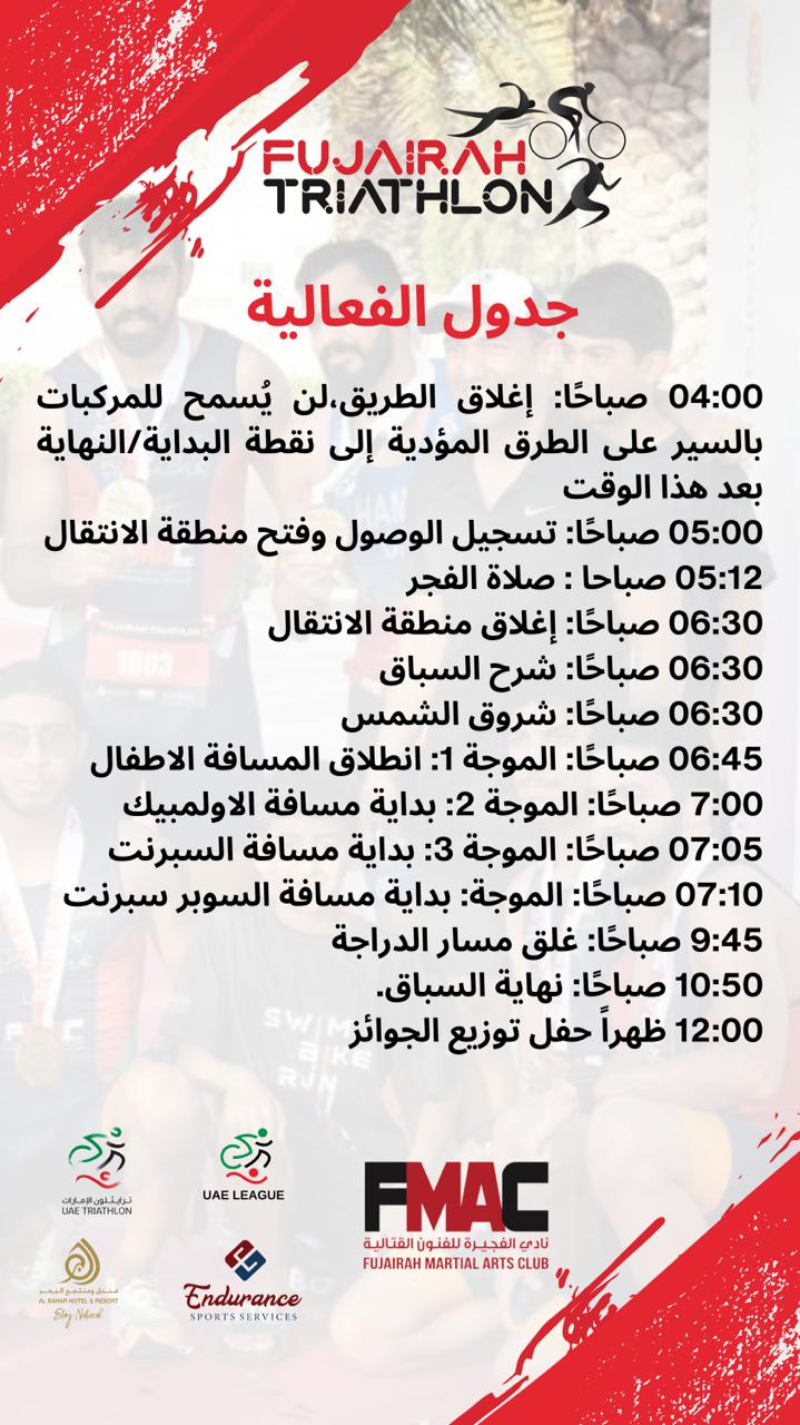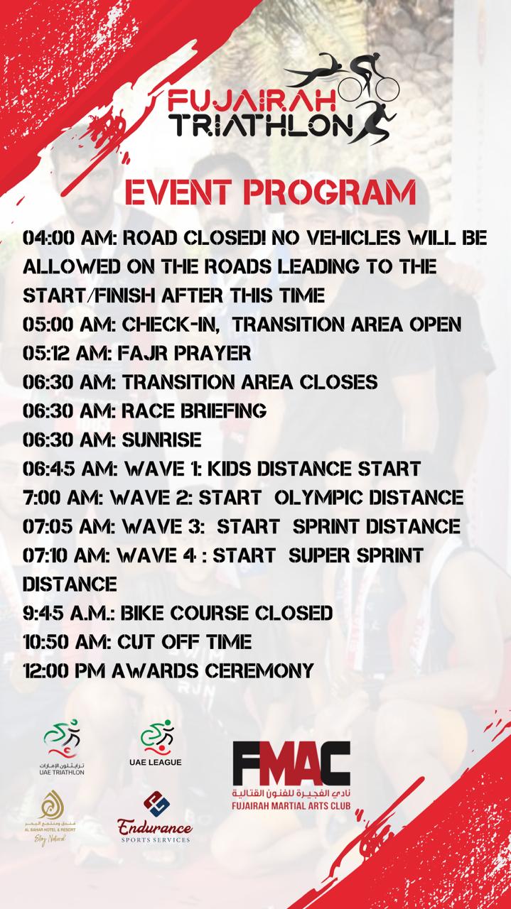 نحن فخورون بأن نقدم لكم النسخة الرابعة من بطولة الفجيرة للترايثلون واتحاد الإمارات للترايثلون على الطرق الخالية من حركة المرور والانتهاء من الركض على مضمار الجري المخصص على بعد أمتار قليلة من حافة المياه في المناظر الخلابة لشاطئ البحر! تشمل المسافات مسافات Olympic Sprint وSuper Sprint وJunior Super Sprint لجميع الأعمار والقدرات
